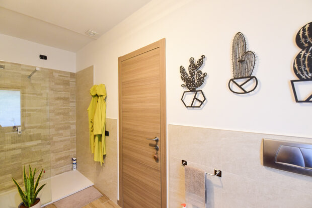 Da qui si accede a un grande balcone vivibile che abbraccia tutta la zona giorno e prosegue fino alla zona notte: un unico spazio esterno che dona respiro agli ambienti e invita a godere dell’aria aperta in ogni stagione.