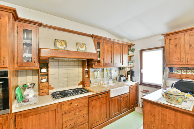 Protagonista indiscusso del living è il camino, che aggiunge un tocco di intimità e calore, rendendo l’ambiente ancora più accogliente nelle stagioni più fredde. Le ampie vetrate lasciano entrare la luce naturale, creando un’atmosfera avvolgente e conviviale, perfetta tanto per i momenti di relax quanto per le serate in compagnia.